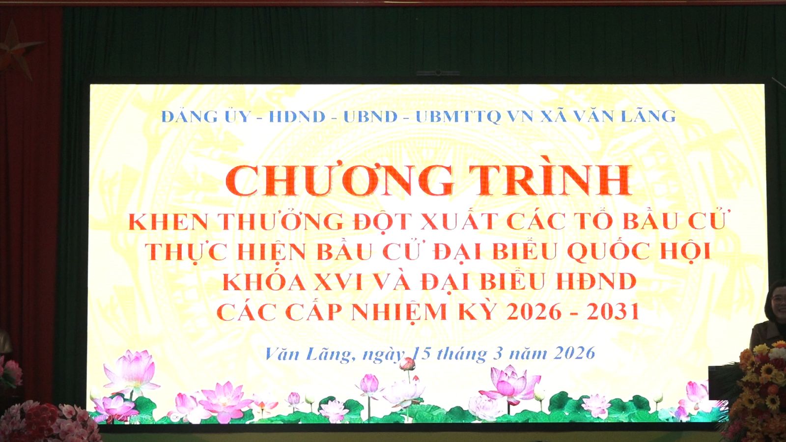 ⏩Tối 15/3/2026, Đảng ủy, HĐND, UBND, Ủy ban MTTQ Việt Nam xã Văn Lãng đã tổ chức Chương trình khen thưởng đột xuất các tổ bầu cử thực hiện tốt công tác bầu cử đại biểu Quốc hội khóa XVI và đại biểu HĐND các cấp nhiệm kỳ 2026–2031. Dự chương trình có đồng chí Nguyễn Thị Minh Hải, Bí thư Đảng uỷ, Chủ tịch HĐND xã, đồng chí Nguyễn Duy Hoàng, Phó Bí thư Đảng uỷ, Chủ tịch UBND xã, các đồng chí lãnh đạo Đảng uỷ, HĐND, UBND, UBMTTQ VN xã. Thành viên Ban chỉ đạo Bầu cử xã và tổ trưởng, thư ký 30 tổ bầu cử trên địa bàn.