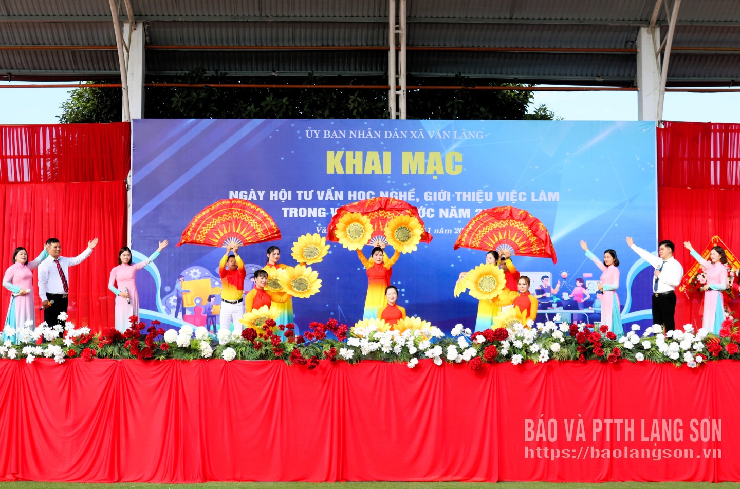 Lãnh đạo xã Văn Lãng tặng hoa cho các doanh nghiệp, đơn vị tuyển dụng tham gia ngày hội