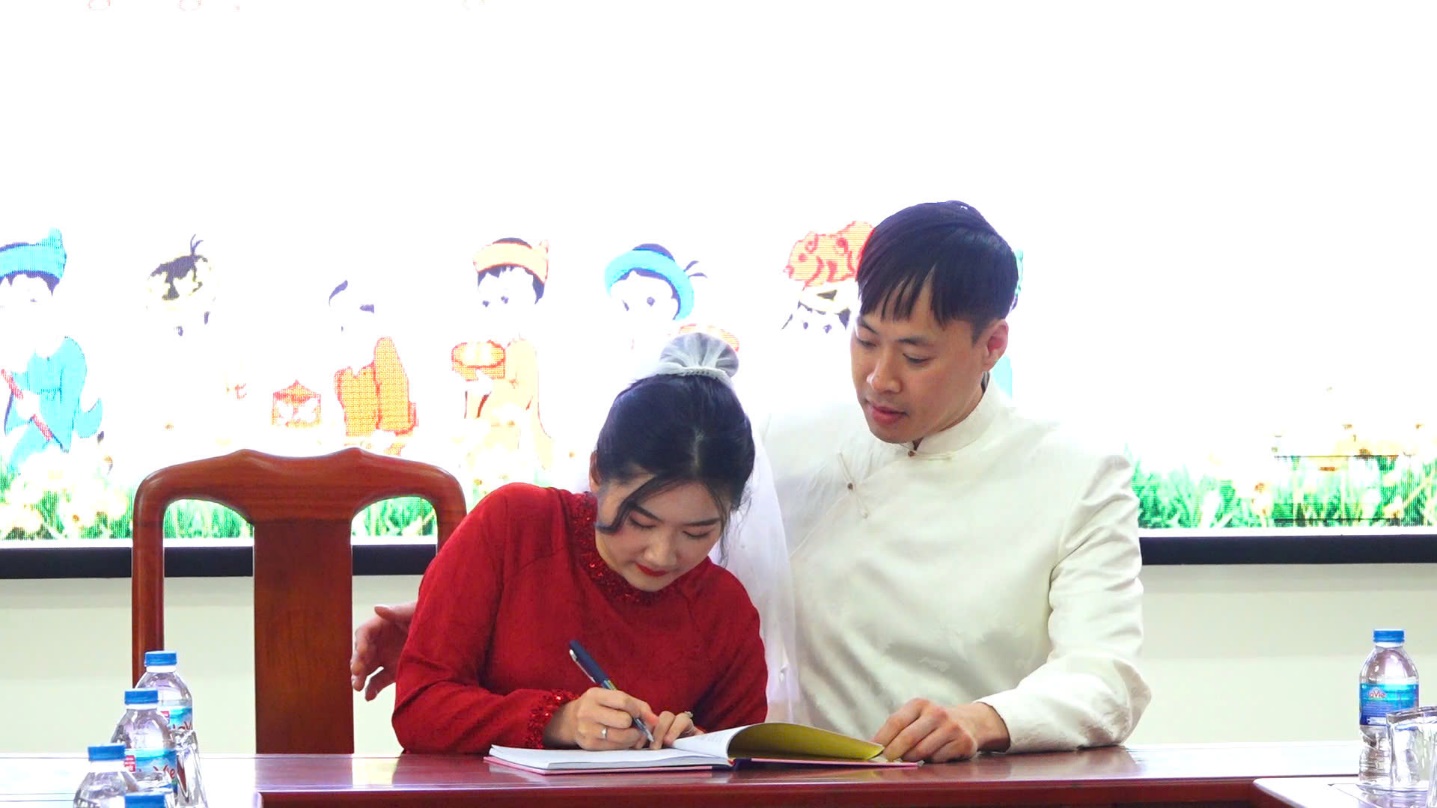 Tại buổi lễ, trước sự chứng kiến của Lãnh đạo UBND huyện, Lãnh đạo, công chức Phòng Tư pháp Văn Lãng, chị Hoàng Thùy Ngân và anh Lieu Vincent Hy Duong đã cùng tự nguyện ký vào Sổ đăng ký kết hôn và Giấy chứng nhận kết hôn theo đúng thủ tục của Luật hôn nhân và gia đình Việt Nam quy định.