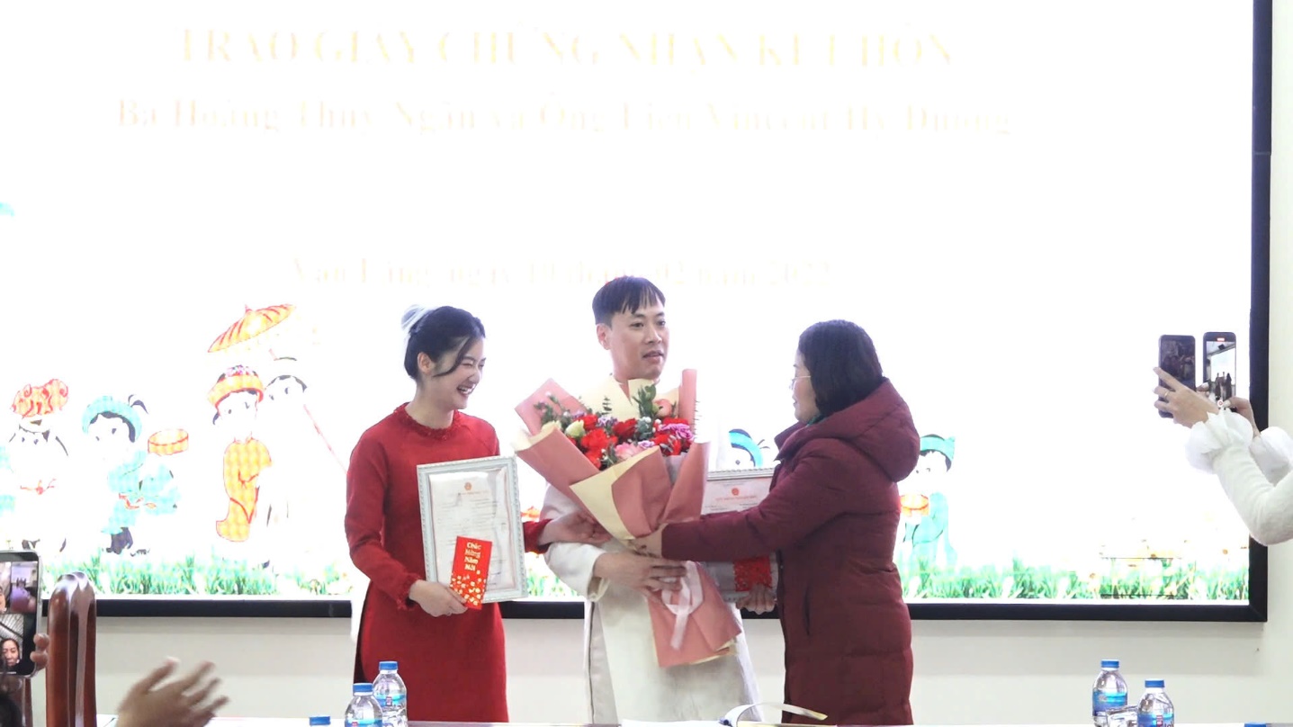 Chiều 10/02/2025, UBND huyện Văn Lãng long trọng tổ chức Lễ trao giấy chứng nhận kết hôn cho chị Hoàng Thùy Ngân sinh năm 1997, trú tại thôn Cốc Nam, xã Tân Mỹ, huyện Văn Lãng và anh Lieu Vincent Hy Duong sinh năm 1984, cứ trú tại Canada.