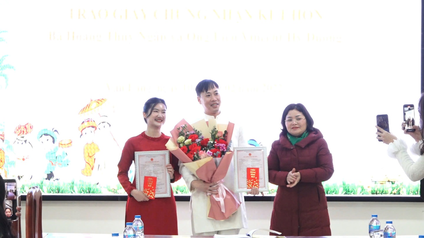 Tại buổi lễ, đồng chí Bế Thị Vẫn, Phó Chủ tịch UBND huyện đã phát biểu, trao Giấy chứng nhận kết hôn và công nhận hợp pháp thành vợ chồng của chị Ngân và anh Duong. Đồng chí chúc hai vợ chồng luôn yêu thương nhau, cùng nhau xây dựng gia đình hạnh phúc, đồng thời chấp hành tốt các quy định pháp luật của hai nước./.